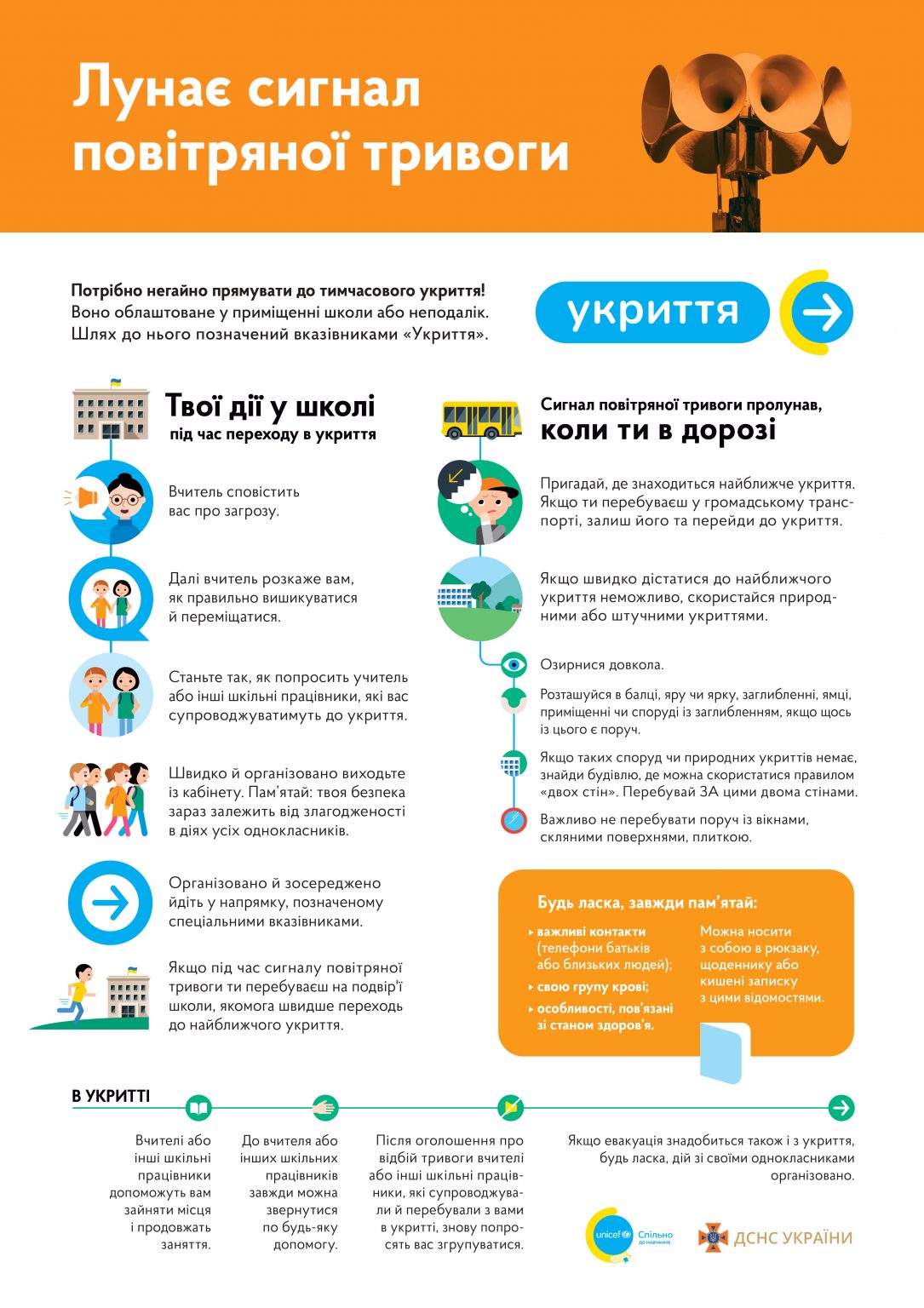 - Усі кого не було в школі під час сигналу тривоги, повинні негайно йти до місця збору й приєднатися до свого класу чи групи.